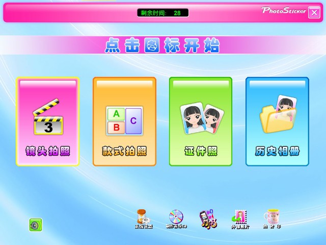 最常用的項目,點擊該大圖標按鈕后將首先選擇鏡頭數(shù),確定鏡頭數(shù)量后進入拍照流程進行拍照、裝扮和打印等流程。
