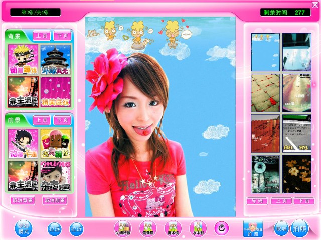 在拍照時,可在主界面左側的背景和前景類別框選擇圖片類別,此時主界面右邊會出現(xiàn)所選類別圖片的縮略圖,選擇喜歡的背景或前景圖片。
